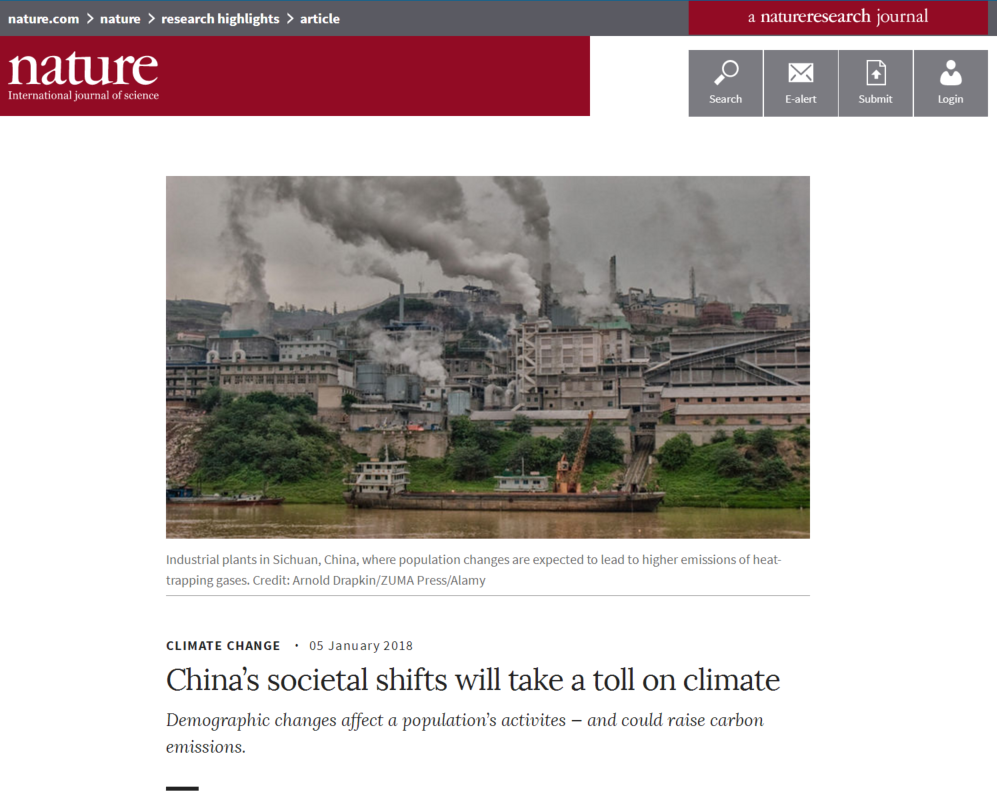 Future Scenarios for Energy Consumption and Carbon Emissions due to Demographic Transitions in Chinese Households by Yu Biying and Wei Yiming was valued as a research highlight in Nature