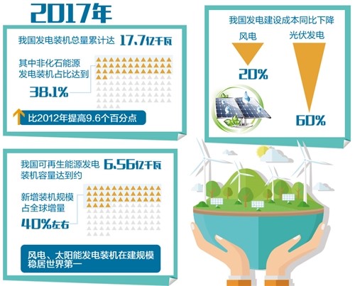 1. 新能源产业追“风”逐“日”领跑全球——2017年,我国非化石能源发电装机量迅速提升