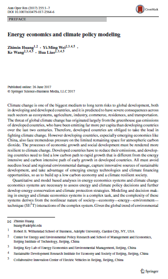 北京理工大学能源与环境政策研究中心主持的Annals of Operations Research特刊(第255卷第1-2期)近日正式出版。Annals of Operations Research是著名出版集团Springer旗下运筹学领域的重要期刊之一。本期特刊的主题是Energy economics and climate policy modeling(能源经济和气候政策建模)。徐特立讲座教授黄志民教授、中心主任魏一鸣教授,以及王科副教授和廖华教授等为该期特刊的客座主编。